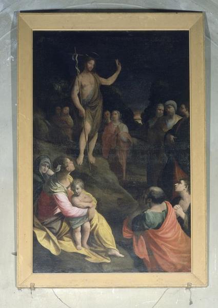 Saint Jean-Baptiste, représenté dans la partie supérieure, vers la gauche du tableau, lève le bras gauche vers des personnages qui l'entourent. au premier plan, à droite de saint Jean-Baptiste, deux femmes sont assises, dont l'une tient un enfant. à droite du tableau, un personnage étendu vu de dos et une femme dans l'attitude de la prière.