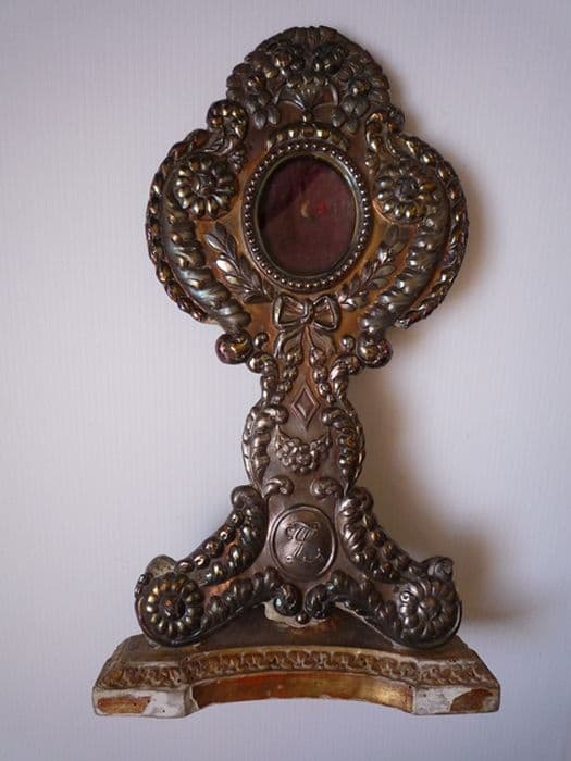 Décor très chargé avec rosace sur le double pied et de chaque côté. Sous la relique un ruban lie deux branches d'olivier.