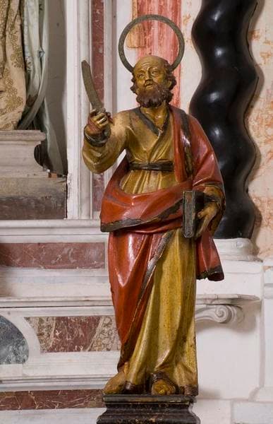 saint Barthélemy apôtre ; en pied ; portant ; auréole ; couteau ; livre