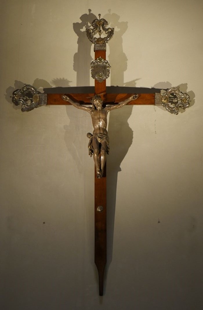 Il s'agit d'un objet composite situé depuis plusieurs dizaines d'années dans le choeur de l'église : cette croix de procession de la confrérie de pénitents Saint-Roch (ou San Rucchelu) est sortie de son emplacement lors des célébrations de Pâques. L'objet est constitué d'une croix de bois, d'un Christ, d'un nimbe rayonnant, d'un titulus et de trois appliques en argent.