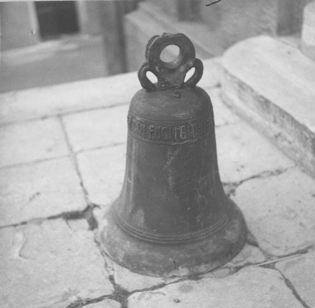 Inscription (partiellement illisible, latin) : ECCE CRVCEM DO[omi]NI FVGITE [...] (en lettres gothiques, chaque lettre étant une lamelle de bronze rapportée sur la cloche).