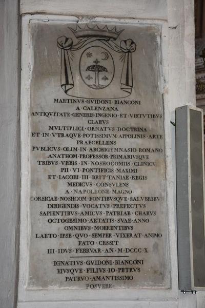 Inscription (latin), date : Martinus Guidoni Bianconi a Calenzana Antiquitate generis ingenio et virtutibus clarus Multiplici ornatus doctrina Et in utraque potissimum Appolinis arte praecellens Publicus olim in archigymnasio romans Anathom. professor primariusque Tribus Urbis in nos ho comiis clinicus Pii VI Pontificis Maximi et Iacobi III Brittaniae Regis Medicus Consulens a Napoleone Magno Corsicae noshcom fontibusque salubribus Dirigendis vocatus prefectus [...] fato cessit M. idus febr. an. MD CCCC X. Armoiries : (au-dessus de l'inscription).