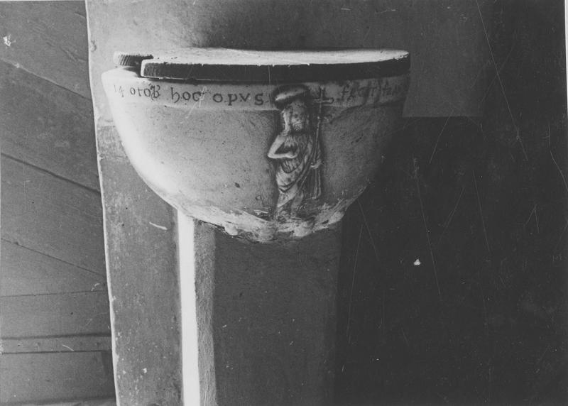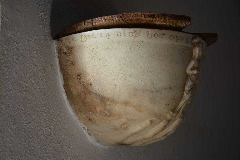 Ce bénitier est orné d'un bas-relief représentant saint Jean-Baptiste.