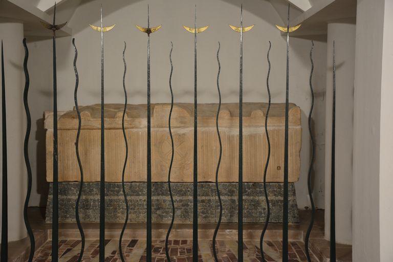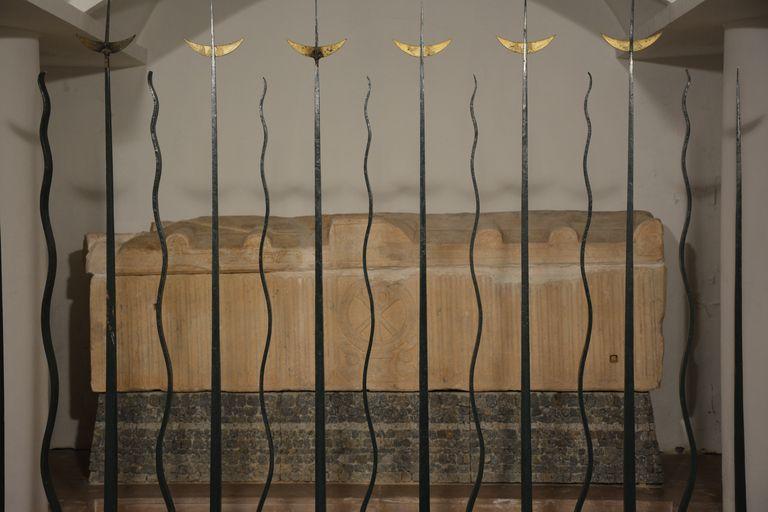 Ce sarcophage paleo-chrétien est orné sur sa face antérieure de deux panneaux de cannelures flanquant un chrisme inscrit dans un cadre circulaire supporté par un pied flanqué de deux dauphins. Les petits côtés sont ornés d'imbrications. Le couvercle brisé porte des acrotères d'angle ornés de masques stylisés.