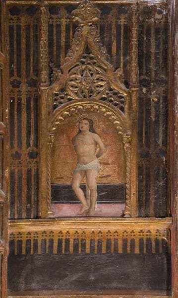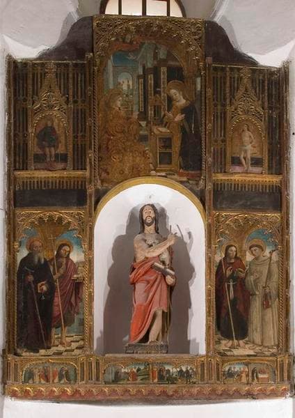 triptyque (panneaux peints) : L'Annonciation, Saint Antoine, Saint Jean-Baptiste, Saint Jacques le Majeur, Saint François, Saint Roch, Saint Sébastien, Scènes de la Vie de la Vierge et de l'enfance du Christ