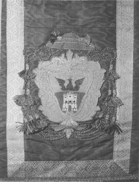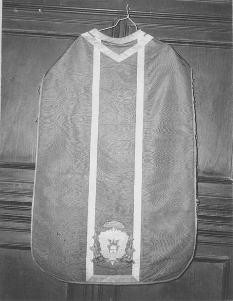Cette chasuble en soie rouge à galons d'or est ornée d'armoiries et de l'effigie de saint Jean-Baptiste.