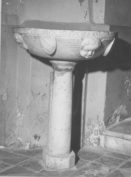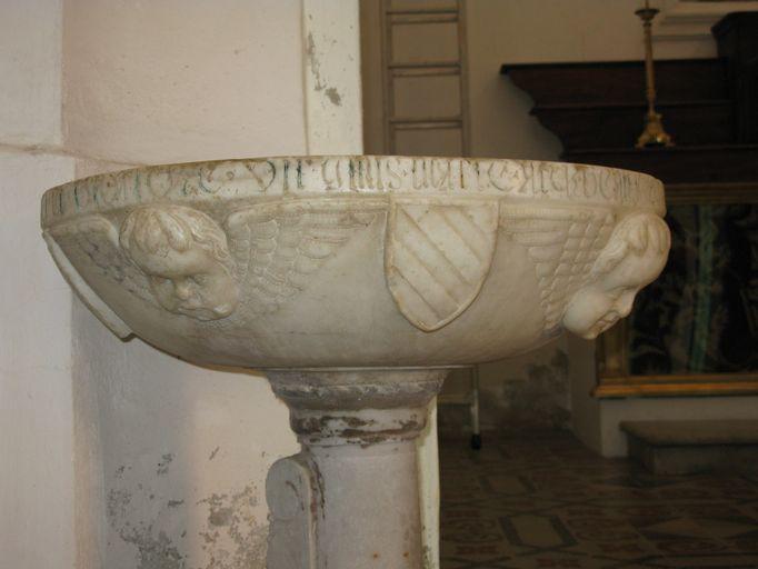 Inscription (partiellement illisible, latin), date : HOC OPVS FECIT FIERI MARTINVS DE FRATE FILIVS FRANCISCI AD LAVDEM DEI ET GLORIOSAE VIRGINIS MARIAE ATQUE BEATI IOANNIS BAPTISTAE MCCCCXXXXIII SUB V DIE XXV MADII [?]. Armoiries : quatre blasons alternant avec quatre têtes d'angelots, armes des Frate de Clavi (lions, château et arbres), des Fieschi de Gênes (bandes diagonales), des de Sopranis, de Gênes également (léopard assis) (sur le pourtour de la vasque).