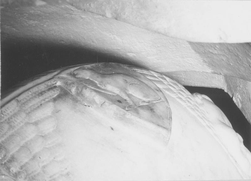 inscription (partiellement illisible, latin) ; date ; armoiries
