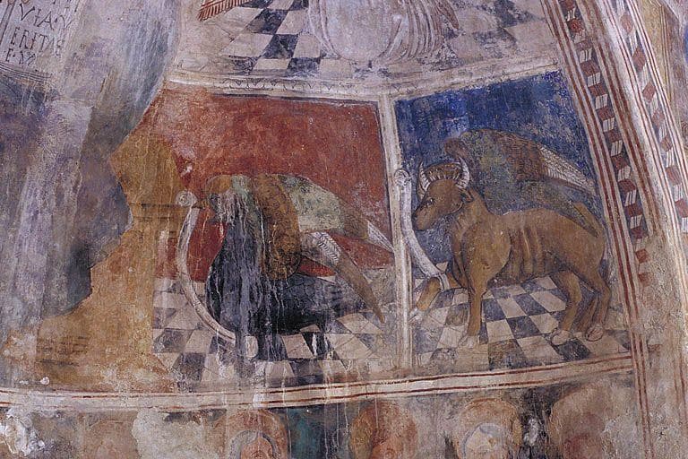peintures monumentales : Le Christ en Majesté entouré d'anges et du Tétramorphe, L'Annonciation et saint Michel, Scènes de la Passion, Figures de saints et le Jugement Dernier