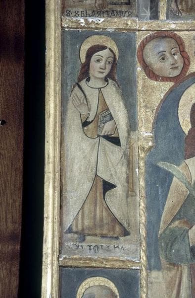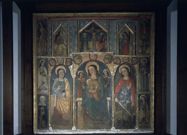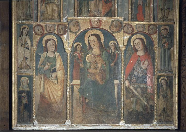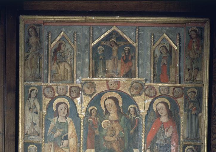 POP | Plateforme ouverte du patrimoinetableau (panneau peint) : La Vierge allaitant l'Enfant entre saint Jean l'Evangéliste et saint Michel, la Crucifixion et huit saints et saintes