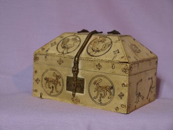 Ce coffret à reliques est de forme rectangulaire. Son couvercle est en forme de pyramide tronquée. Sur le couvercle sont placées trois baguettes en cuivre, dont deux sont articulées en charnières ; la troisième sert à fixer le couvercle sur le devant du coffret, au moyen d'une pointe fixée sur une plaquette en cuivre. Le décor représente des animaux et des fleurs. L'intérieur, garni de parchemin, contient des reliques.