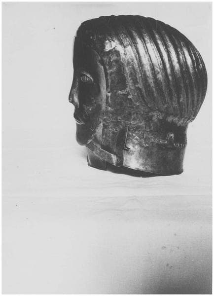Le crâne présente une réparation ancienne consistant en une pièce de métal mise à l'intérieur. La face est mobile : une sorte de masque s'emboîtant dans le front est fixé à la base par deux charnières en métal. Les yeux, faits d'émail blanc et bleu, sont rapportés et fixéx par deux pointes rivées. Les lèvres sont en cuivre jaune.Le col du vêtement est en forme de dentelures, fait d'une bande de métal rapportée et fixée par des pointes rivées.