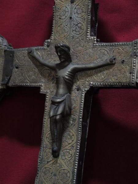 Cette croix de procession est en bois recouvert de lames de cuivre sur les deux faces.