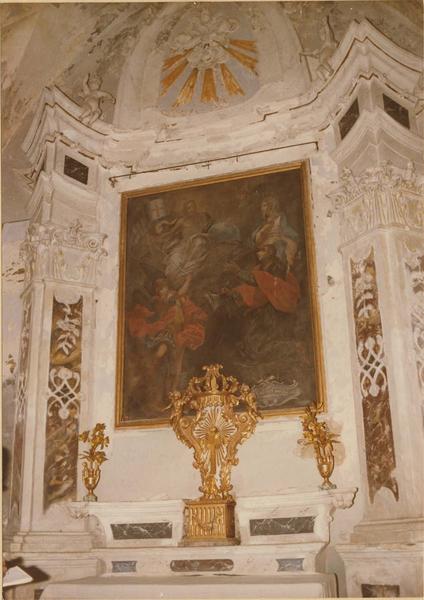 Armoiries : armes de Gênes (sur la toile, au-dessus du Christ). Inscription, date : GIO.AND.A.E SANTO FIGLI DEL Q. ANGELO Sto PIACENSINI ANNO FATO E. CONFEGIRO LA MENRE DEL TEFRARORE LANNO 1731 (au bas de la toile, dans un cartouche).