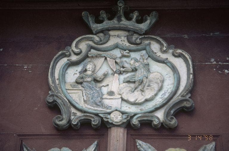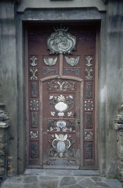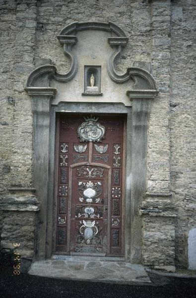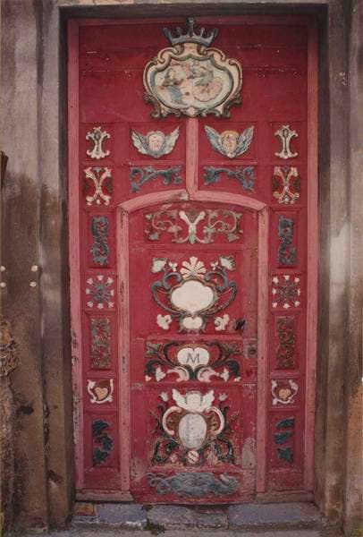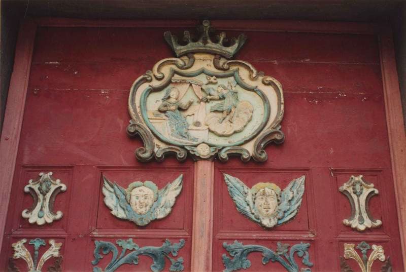 Cette porte possède une petite porte de service. Le décor polychrome est à base de blanc, bleu et rose passé sur fond vieux rouge. Les motifs se trouvent dans les caissons. En partie haute, le motif représente l'Annonciation.