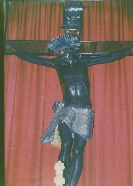 Christ en bois peint en marron foncé, taché de rouge (plaies). Pagne, couronne et parchemin (INRI) sont en feuille d'argent.