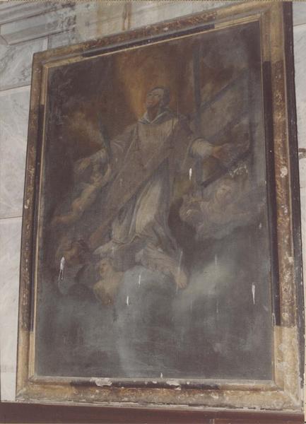 Le saint est en adoration les yeux levés vers le ciel les bras écartés. Derrière lui se trouve un gril ou une échèlle ? A ses pieds, deux angelots ainsi qu'un autre derrière lui. Cependant le bas de la toile est très sombre et il est difficile de donner des précisions.