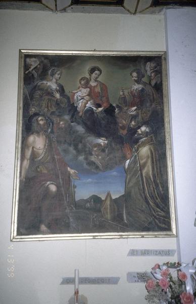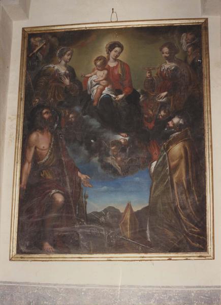 La Vierge porte l'enfant Jésus sur sa jambe gauche. A droite et à gauche deux saintes. Saint Jean-Baptiste est représenté en bas à gauche et l'évêque (saint Martin ?) à droite à genoux, la mitre posée devant lui.