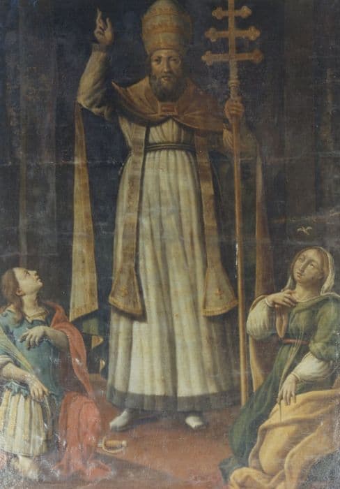 saint Marcel pape (tiare, bénédiction), saint : martyr (palme)