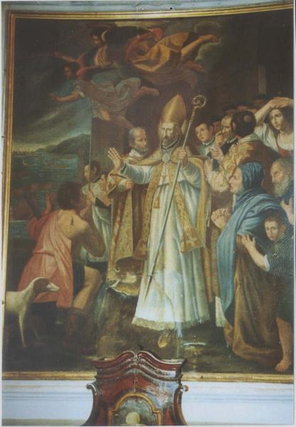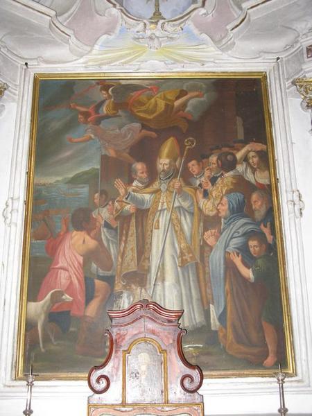 Cette toile est une copie d'un grand retable de Domenico Fiasella commandé pour l'église de Santa Maria Assunta di Carignano (à Gênes). La scène représente le miracle de 1584, durant lequel saint Alexandre Sauli, évêque d'Aleria résidant à Cervione, fit se lever une tempête qui dispersa une flotte barbaresque.