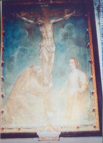 tableau d'autel : Saint François et sainte Lucie aux pieds du Christ en Croix, cadre