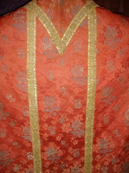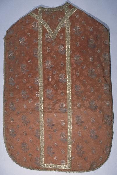 Ces ornements sont en damas de soie (rose saumon) broché argent (filé, frisé). La chasuble présente un montage italien, dit 'à la romaine'. Les extrémités de l'étole sont en queue d'aronde (style italien).