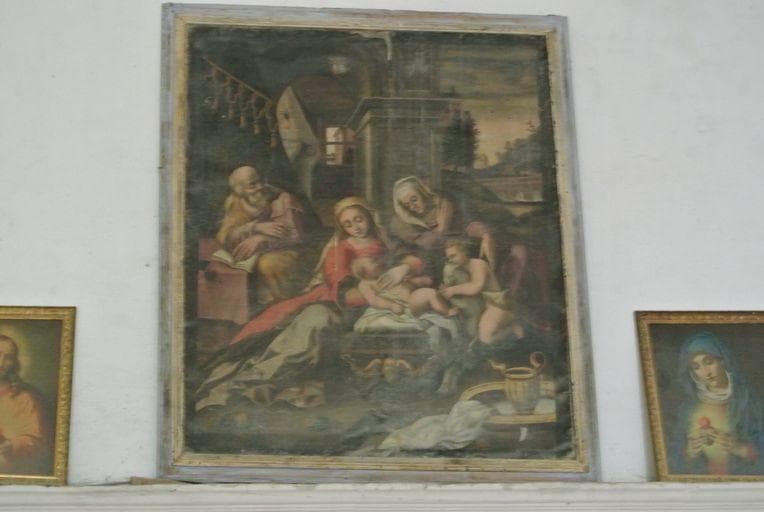Huile sur toile dans un cadre en bois mouluré, peint en bleu et jaune, représentant la Vierge, l'Enfant Jésus dans un berceau, saint Jean-Baptiste enfant, saint Joseph et sainte Elizabeth dans un intérieur largement ouvert sur un paysage.