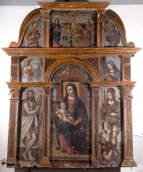 Retable peint à tempera puis repeint à l'huile : sept compositions réparties autour d'une scène centrale représentant la Vierge à l'Enfant. L'ensemble s'inscrit dans un cadre en bois qui reprend le vocabulaire architectural : arc, pilastres, corniche, entablement, volutes.