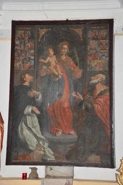 Au centre de la composition, la Vierge à l'Enfant dite Notre Dame du Rosaire. L'Enfant remet un chapelet à saint Dominique, agenouillé à gauche. La Vierge remet la palme du martyre à saint Pierre, agenouillé à droite. De part et d'autre de la Vierge sont représentés 15 tableautins figurant les mystères du Rosaire.