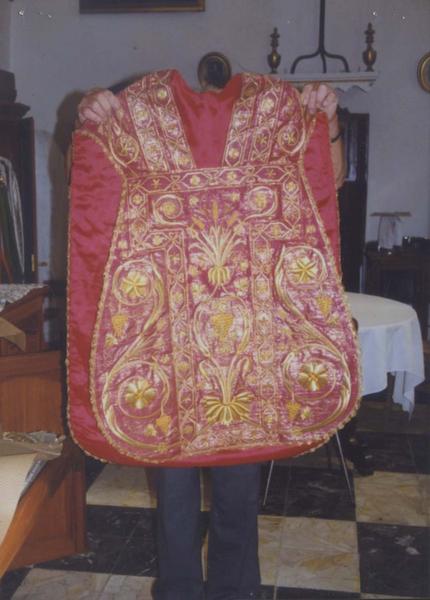 Chasuble lamé or sur soie rouge, à motifs de rinceaux végétaux, de grappes de raisins, d'épis de blé, d'étoiles, et, au dos, des armes du cardinal.