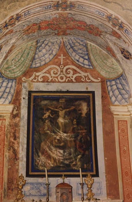 Huile sur toile représentant le Christ en croix entouré par la Vierge éplorée, saint Jean et Marie-Madeleine, et, en buste, aux angles inférieurs de la toile, deux personnages vêtus de blanc. Tous deux sont cagoulé, mais l'un d'eux a relevé sa cagoule.