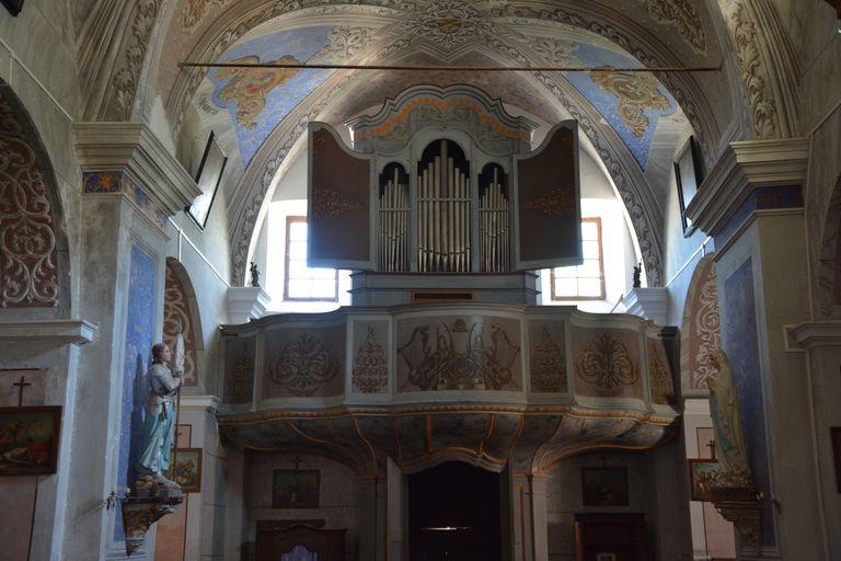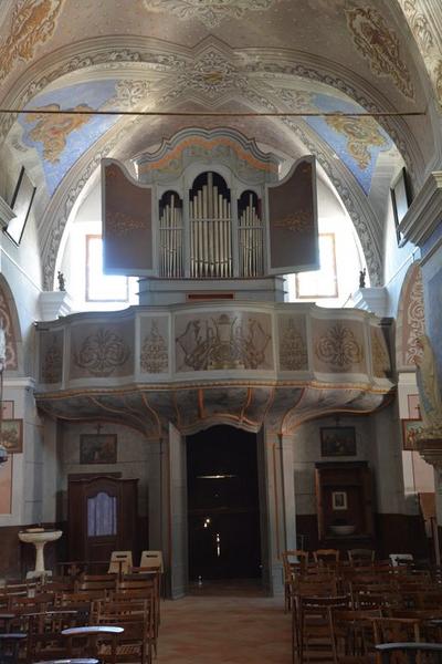 Buffet en châtaignier avec volets. Le buffet et la tribune sont peints. Des instruments de musique sont représentés sur la tribune. La façade est constituée de trois plates-faces avec des tuyaux en étain disposés en mitre. Une barre transversale retient les tuyaux de façade dans chaque plate-face. La corniche monumentale suit les courbures des plates-faces en les accentuant. Les volets fermés montrent une peinture de David musicien et une de Sainte Cécile musicienne, habillée en religieuse.