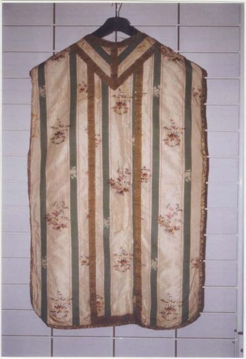 Chasuble et étole, pékin de soie, fond en satin de soie blanc et tissu secondaire en cannelé de soie vert-amande, ensemble broché de fils de soie polychromes, applications de passementerie ; galon façonné au fil d'or, doublure de taffetas jaunes ; motifs en semis de bouquets de fleurs et d'oiseaux. L'un des motifs intègre deux oiseaux tenant une couronne de fleurs dans leur bec.