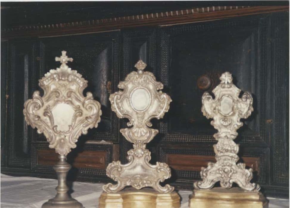 Premier reliquaire : reliques des saints Pierre, Paul et André. Deuxième reliquaire : reliques des saints apôtres Thomas et Barnabé, des saints Laurent, Louis roi de France, Roch et François-Xavier. Troisième reliquaire : reliques de sainte Lucie.