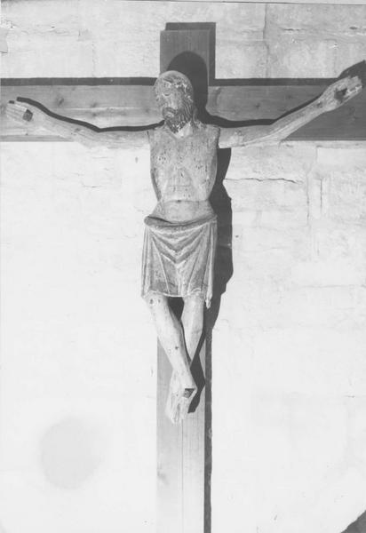 Tête légèrement tournée vers la droite, yeux clos, cheveux longs, barbe et moustache à boucles symétriques, perizonium retenu sur les hanches par un pli en bourrelet et descendant jusqu'aux genoux en tablier à plis cassants en V ; torse droit, bras étendus à l'horizontale, coudes légèrement ployés, mains franchement ouvertes, corps criblé de blessures, front meurtri par la couronne d'épines, large fente au côté droit, pieds superposés, le gauche relevé comme pour s'appuyer sur un suppedaneum (disparu avec la croix originale) ; polychrome
