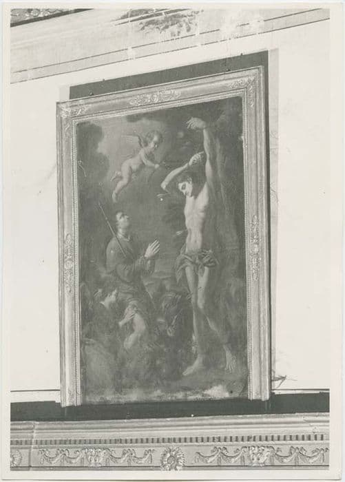 Tableau rectangulaire et son cadre en bois doré représentant le martyr de saint Sébastien, entouré de saint Roch, priant, et d'anges.