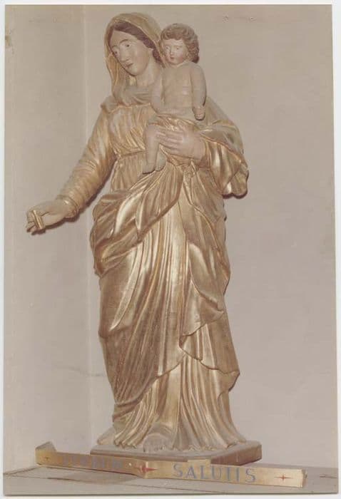 Statue en bois sculpté et doré représentant la Vierge en robe dorée tenant de sa main gauche l'enfant Jésus. Il semble qu'elle tenait de sa main droite un objet qui a disparu.