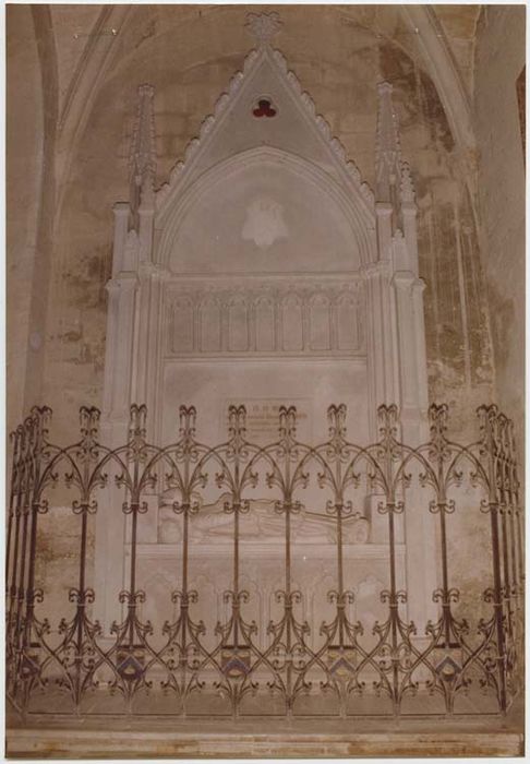 Tombeau en pierre sculptée et sa grille en fer forgé. Mausolée disposé comme un enfeu, néogothique ; effigie de l'évêque en gisant, dans ses vêtements sacerdotaux. Clôture : 16 fins poteaux de fer forgé, formant dans leur partie haute des lancettes à volutes, terminés par quatre crochets rabattus vers le bas. Dans la partie basse, succession d'écus armoriés (armoiries de Mgr Bauyn).