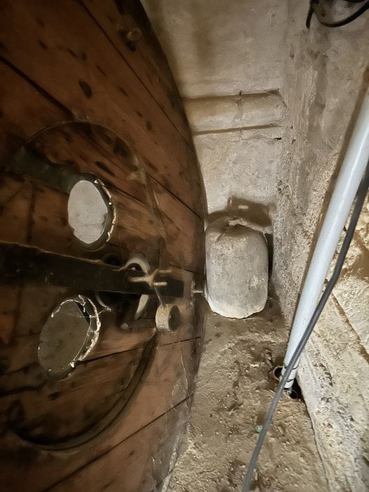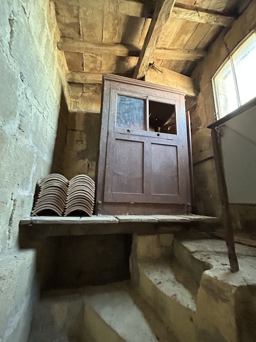 Le mécanisme est déposé dans la salle du conseil municipal ; sa caisse est toujours en place au sommet de l'escalier d'accès au toit de l'église ; les poids sont sous cet escalier.
