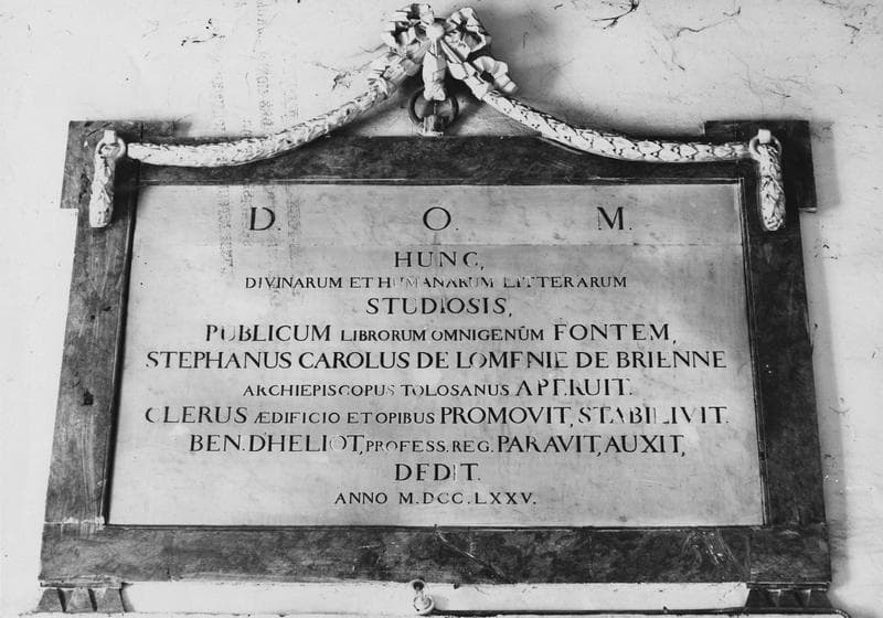 Plaque avec une inscription latine commémorant l'ouverture au public par l'archevêque de Toulouse, Loménie de Brienne, de la bibliothèque dite du clergé formée et donnée par l'abbé d'Heliot.