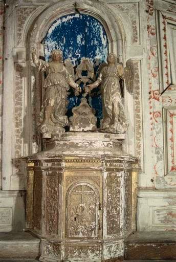 Tabernacle architecturé (en forme de temple polygonal) en bois sculpté et doré, orné d'une croix, d'un pélican et d'une couronne d'épine sur la porte ; deux statues d'anges en bois sculpté et peint (l'un a perdu son bras gauche).