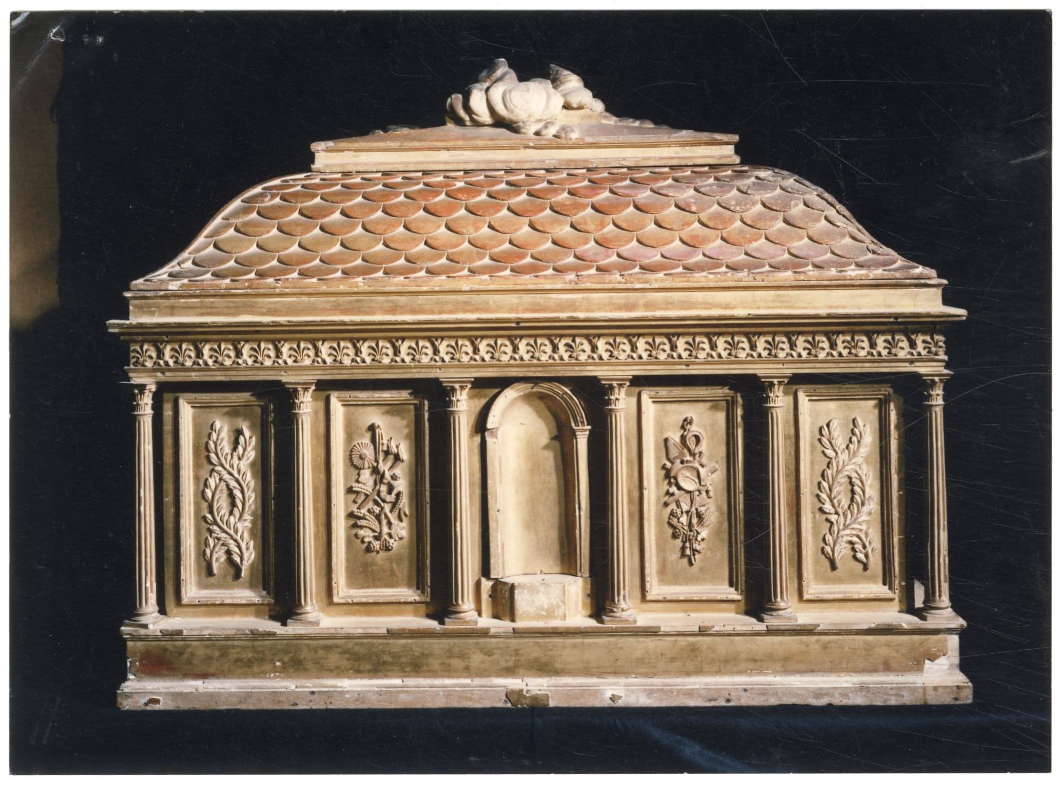 Ce reliquaire se présente comme un coffre orné d'une colonnade de style corinthien, reposant sur un soubassement et portant une frise ornée de palmettes. Un couvercle en forme de dôme à quatre pans est recouvert d'écailles et terminé par un plateau portant un nuage. Sur chaque côté, entre les colonnes, des panneaux ornés de trophées religieux ou de palmes entrcroisées ; au centre, une niche cintrée qui devait recevoir une statue.