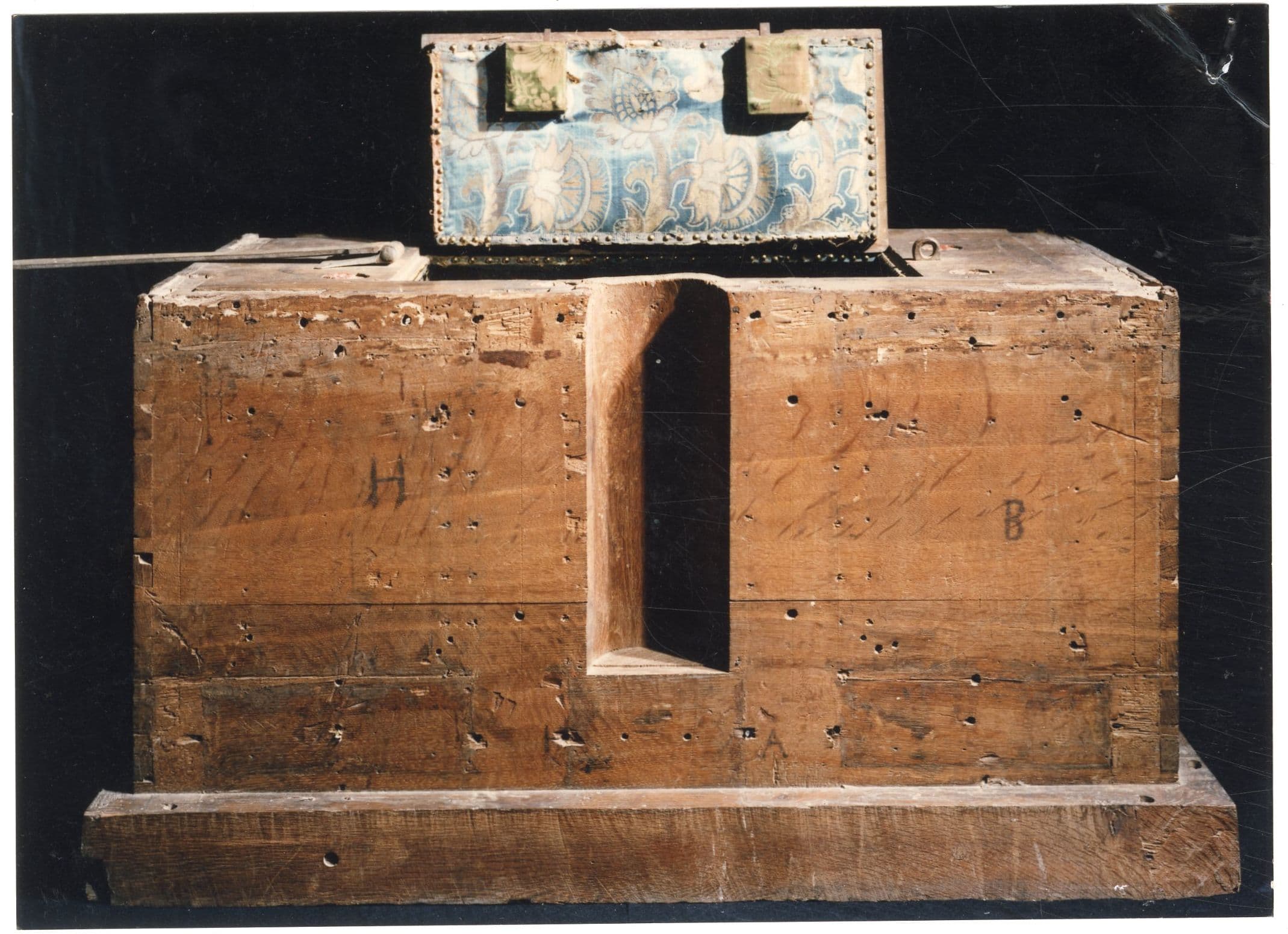 Coffre en bois présentant sur chaque face une niche cintrée arasée. La face supérieure est munie d'un volet à deux charnières, fermé par deux serrures. Le volet est protégé par une barre de fer plate qui s'incruste dans un anneau. Autour de ce volet, huit emplacements pour les sceaux de cire. Les parois présentent de nombreux trous correspondant à la fixation des anciens revêtements d'argent doré. Les lettres sont des repères d'assemblage. A l'intérieur, soie à fond bleu et motifs de rinceaux de fleurs et de fruits roses et jaunes.