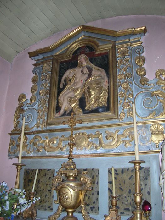 Fronton composé d'un panneau à prédelle ornée de rinceaux et de cuirs, surmontée d'un petit retable avec une Vierge de Pitié dans un encadrement mouluré, flanquée de guirlandes de fleurs et de deux volutes de feuillage.