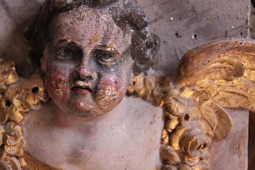 médaillon : motif rocaille ; guirlande : fleur ; angelot : tête ; ange : prière ; Coeur Sacré de Jésus ; chute végétale : feuillage ; croix