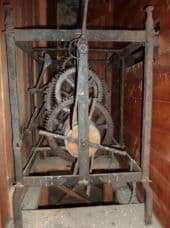Horloge à cage et à échappement à ancre, dotée de rouages verticaux et de fixations par clavettes. Elle possède une sonnerie à roue de compte.