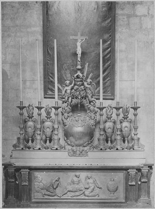 Tabernacle formé d'une boule, de chaque côté de laquelle s'élèvent deux anges, tenant le crucifix. Au-devant du tombeau, une descente de croix.