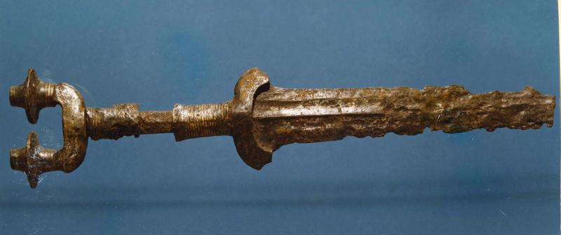 Epée Halstatienne. Cette épée a été découverte au lieu dit Carbou, commune de Larresingle, dans un tombeau en forme de caisson composé de pierres et contenant également un squelette et des poteries grossières. Découverte au début de ce siècle, elle servait en 1976 de tisonnier à l'école de Larresingle. Cet usage lui a fait perdre 10 cm de sa lame, l'épée mesurant 37 cm lors de sa découverte