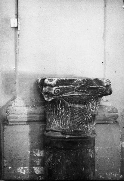 Chapiteaux de type byzantin, à décor de volutes, de rinceaux et de motifs géomètriques en méplat.