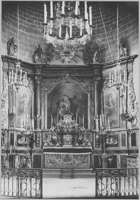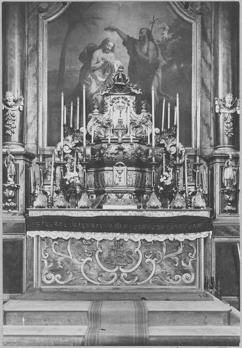 Retable avec tabernacle et six chandeliers. Le contre-retable se développe au fond de l'abside en cul-de-four : ses panneaux sont insérés entre des pilastres et des colonnes à chapiteaux corinthiens. Contre la face extérieure du socle des deux colonnes, une console supporte une statuette. Chaque panneau contient un tableau encadré dans une riche bordure en bois doré. Celui du centre représente le Baptème du Christ et porte les caractères du 17e siècle. Les lambris sont surmontés de chaque côté du sanctuaire par deux frontons en bois doré. Au-dessus du siège principal du banc-d'oeuvre, s'avance une acanthe formant dais.